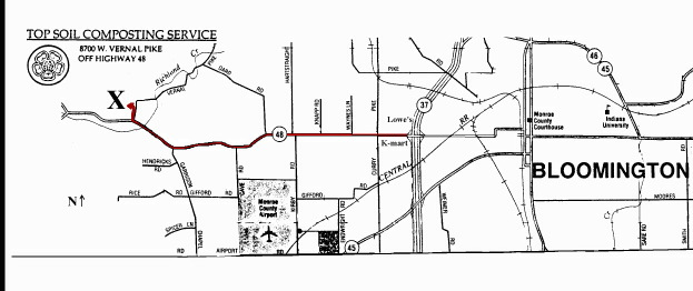 Our facility is located in Monroe County, Indiana at 8700 W. Vernal Pike (at the corner of State Route 48, which is W. Third St. from Bloomington). Our hours vary with the weather and season, but generally, we're open from 9am to 5pm Monday through Saturday. We accept grass, leaves and garden clippings for free, but there is a fee for woody material, such as branches, limbs, logs and stumps. The fee depends upon the amount - a small pickup truck full of logs would cost $5.